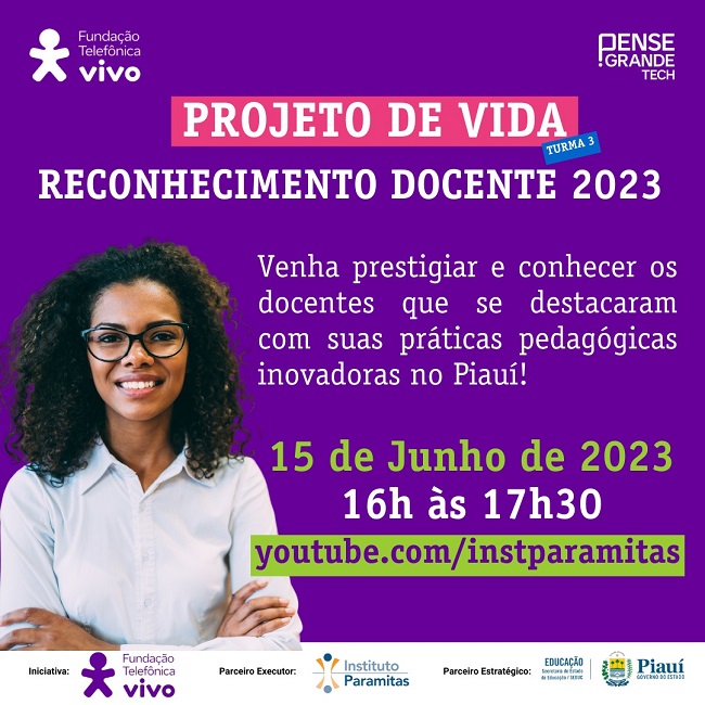 O Encontro para o Reconhecimento Docente do Pense Grande Tech Piauí acontecerá na próxima quinta-feira,15, das 16h às 17h30, de forma on-line, com transmissão ao vivo no Canal do YouTube do Instituto Paramitas https://www.youtube.com/watch?v=Y-x92piXPCQ.